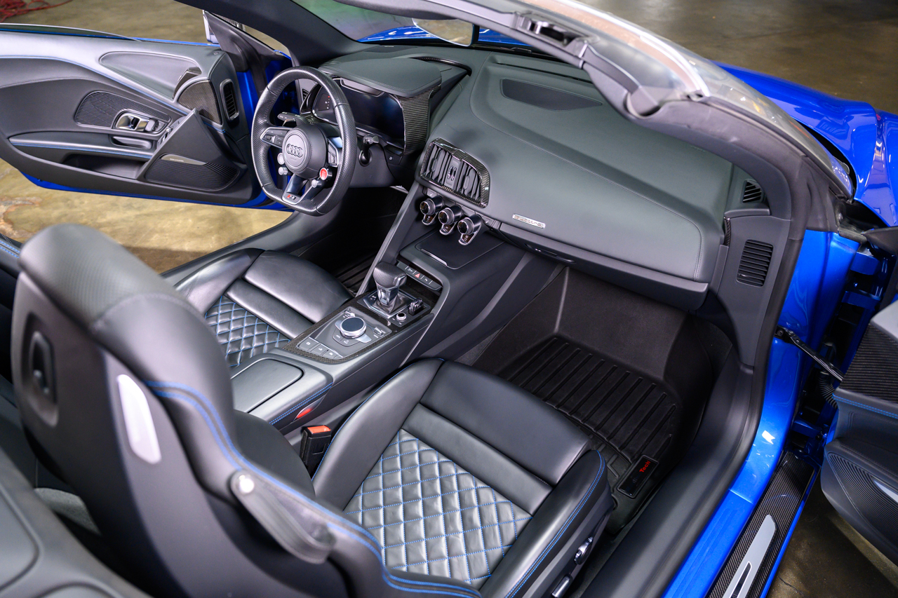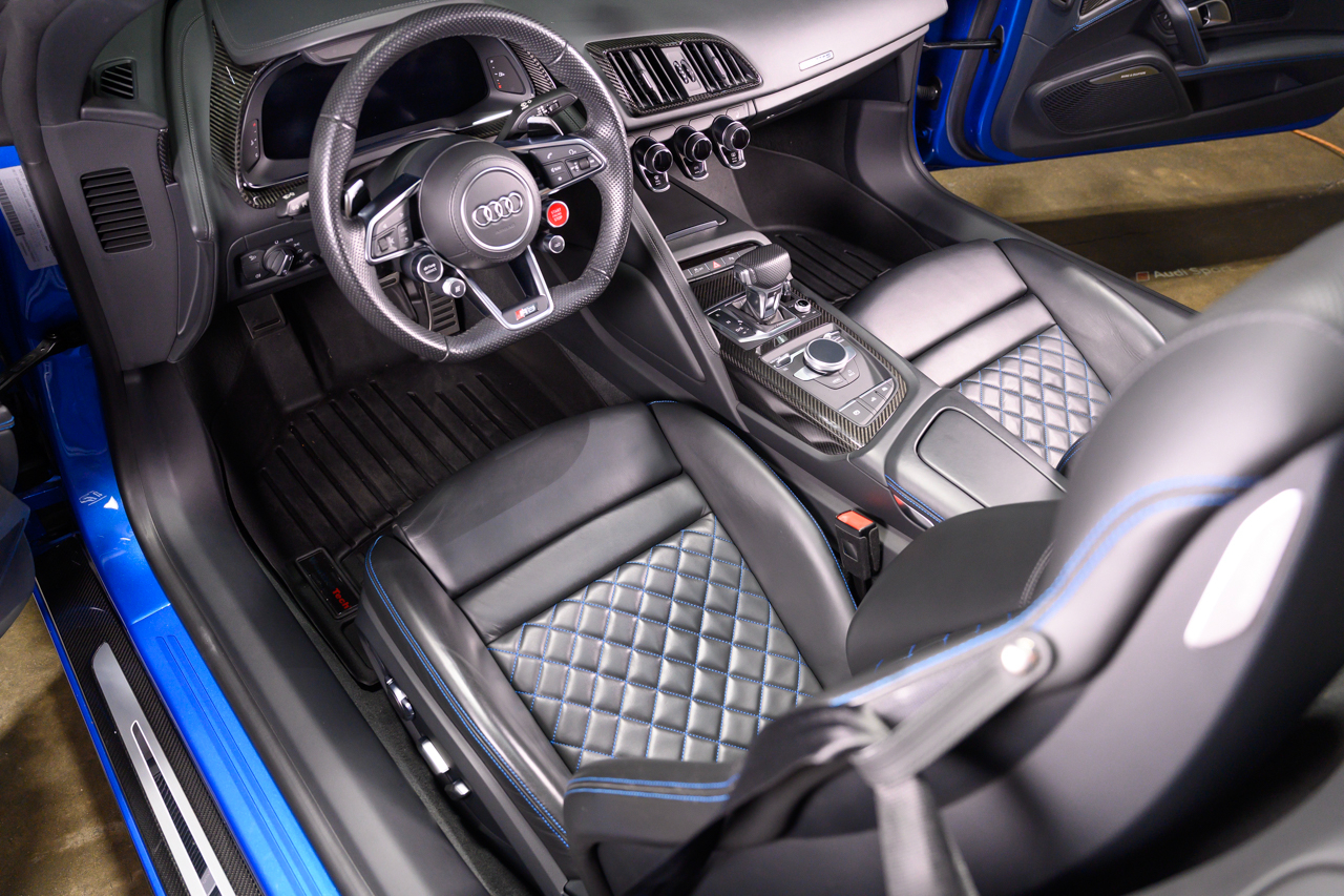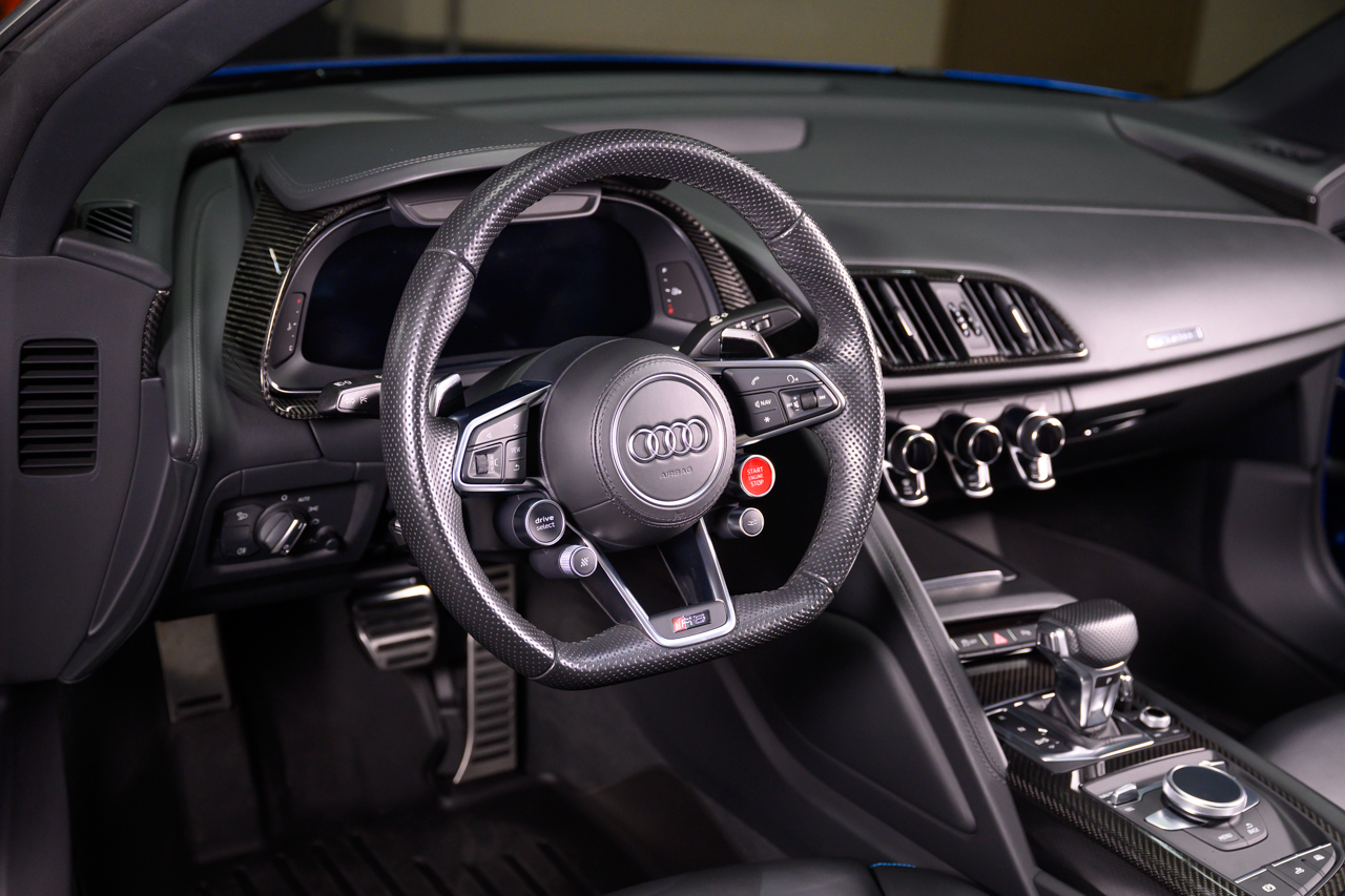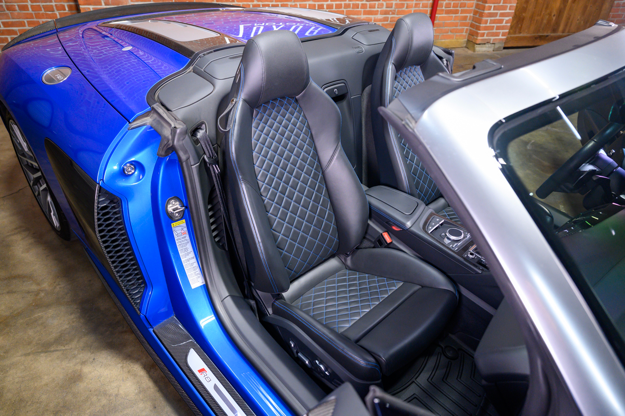 This absolutely stunning example of an Audi R8 V10 Plus Spyder comes offered in Ara Blue Crystal effect over a Black leather interior with Ara Blue stitching.